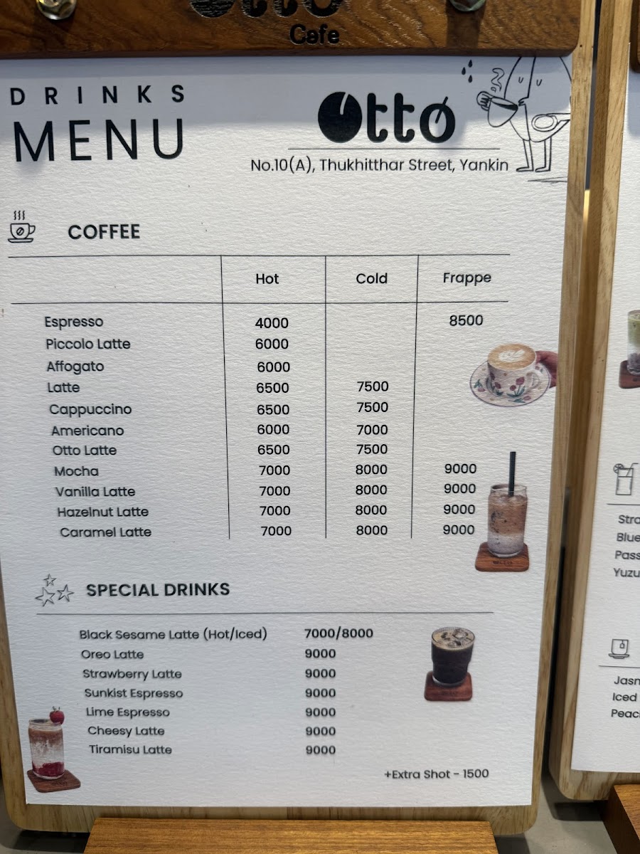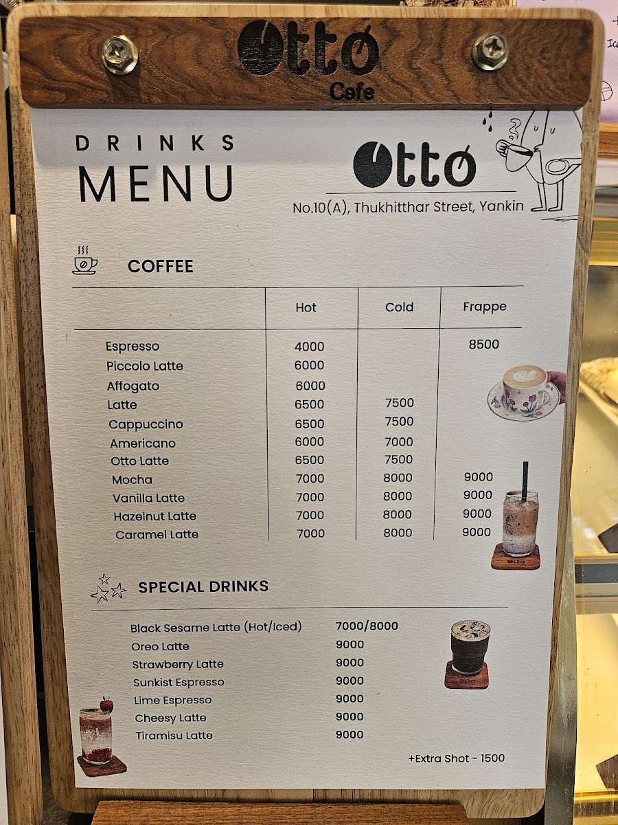 The menu primarily features a variety of coffee drinks, including specialty lattes such as Black Sesame Latte and Cappuccino Latte. Alongside the beverage selection, there are light food options available, including sandwiches and desserts like Chocolate Crepe Cake. The menu is suitable for coffee breaks, casual meetups, or light meals throughout the day.